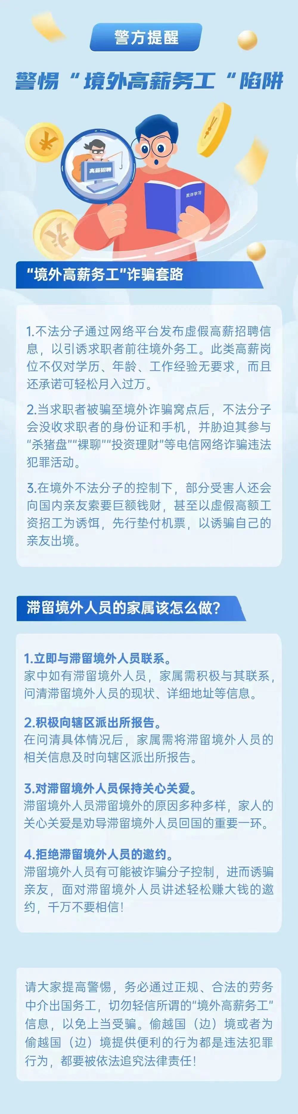 2.只提“高薪”,不要求文凭、语言、技能的招聘,要高度警惕!凡是让你偷越国(边)境的务工招聘都是诈骗!
