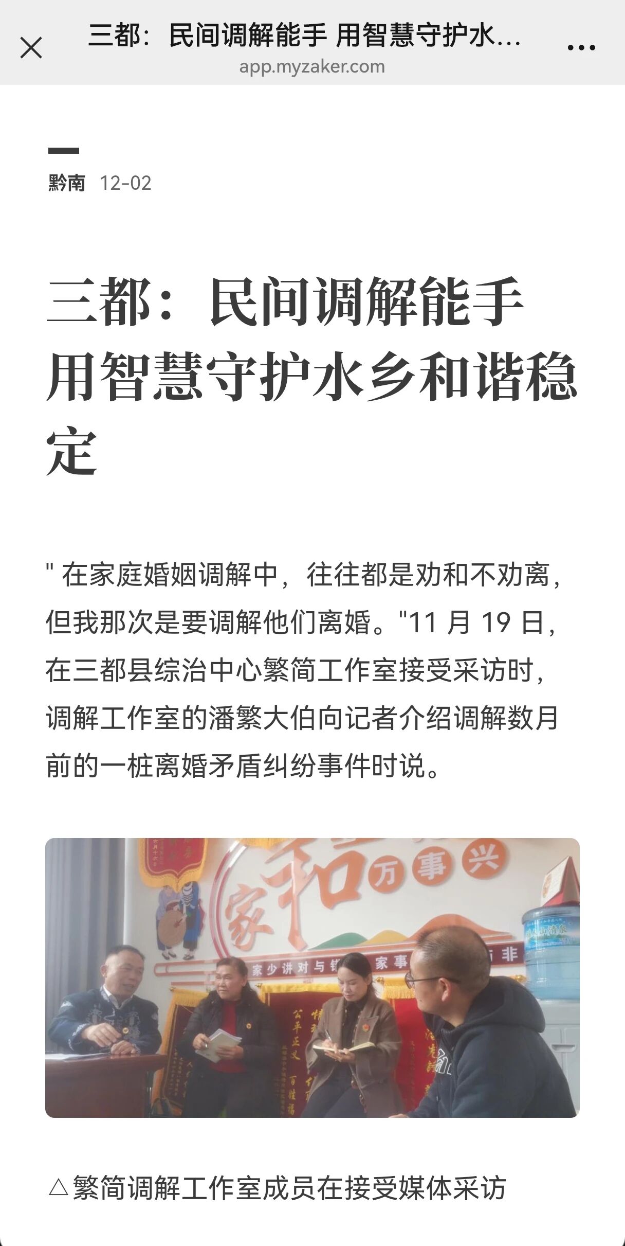 "在家庭婚姻调解中,往往都是劝和不劝离,但我那次是要调解他们离婚。"11月19日,在三都县综治中心繁简工作室接受采访时,调解工作室的潘繁大伯向记者介绍调解数月前的一桩离婚矛盾纠纷事件时说。