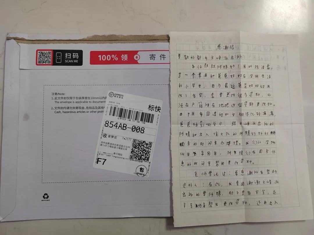4月23日,户籍民警收到了一个来自深圳的包裹,里面是陈先生儿子书写的一封感谢信与一面锦旗,感谢公安机关的及时帮助。