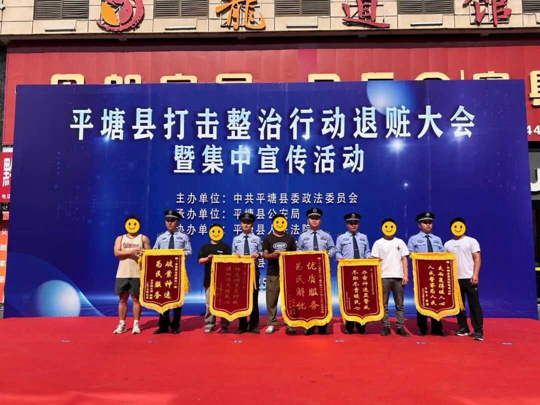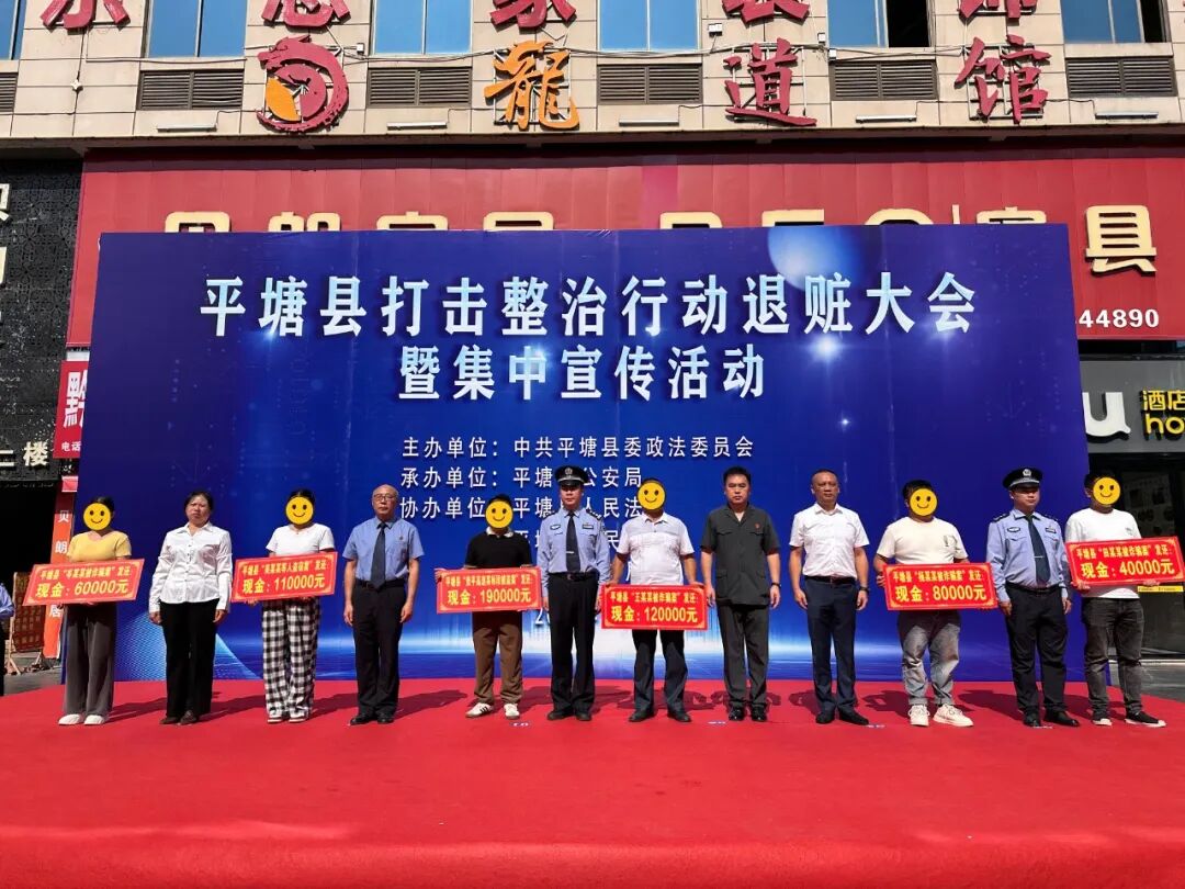 近日,为充分展示政法机关打击违法,全力守护群众财产安全的坚定决心与显著成果切实提升人民群众安全感,贵州省平塘县在新区农贸市场举行平塘县打击整治行动退赃大会暨集中宣传活动,向受损群众代表返还赃款赃物。