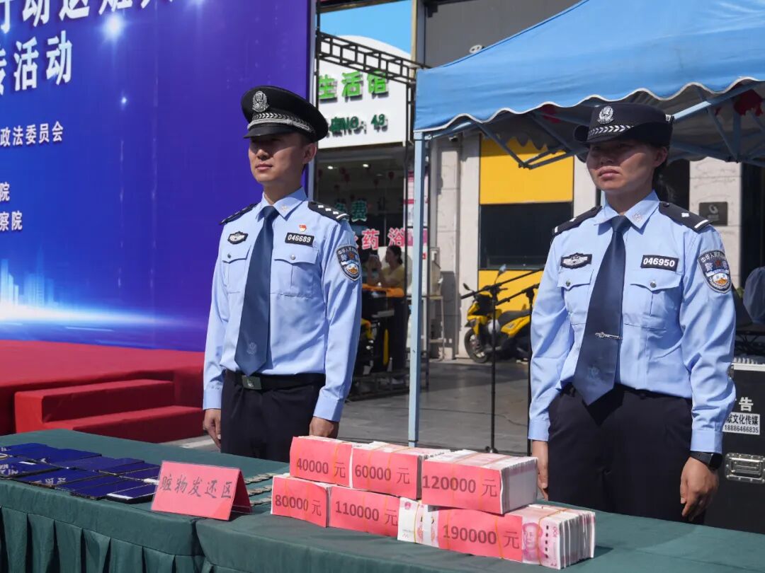 最让人动容的环节来了!60 万元现金整齐码放在台上,受害群众依次接过失而复得的钱款。