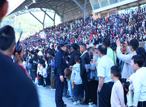 下午时分,赛场内掌声雷动,骑手们的激烈角逐让观众席沸腾。在现场可以看到,赛场周边的公安干警和志愿者手拉手组成柔性人墙,随着人流变化灵活调整站位,既不遮挡观众视线,又能及时疏导拥挤人群。