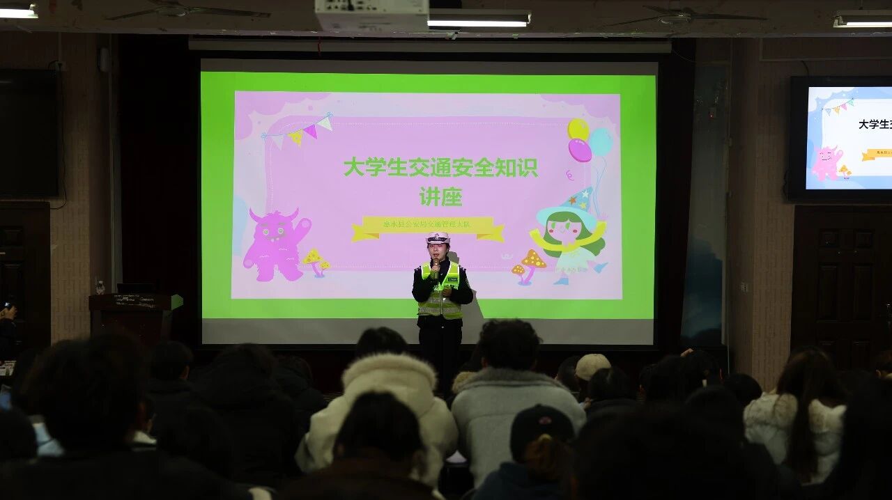 交管大队民警围绕“大学生交通安全知识”,结合校园周边道路交通环境特点,引用交通事故案例视频,向同学们深入浅出地讲解了道路交通法律法规、交通信号灯及交通标牌的含义。