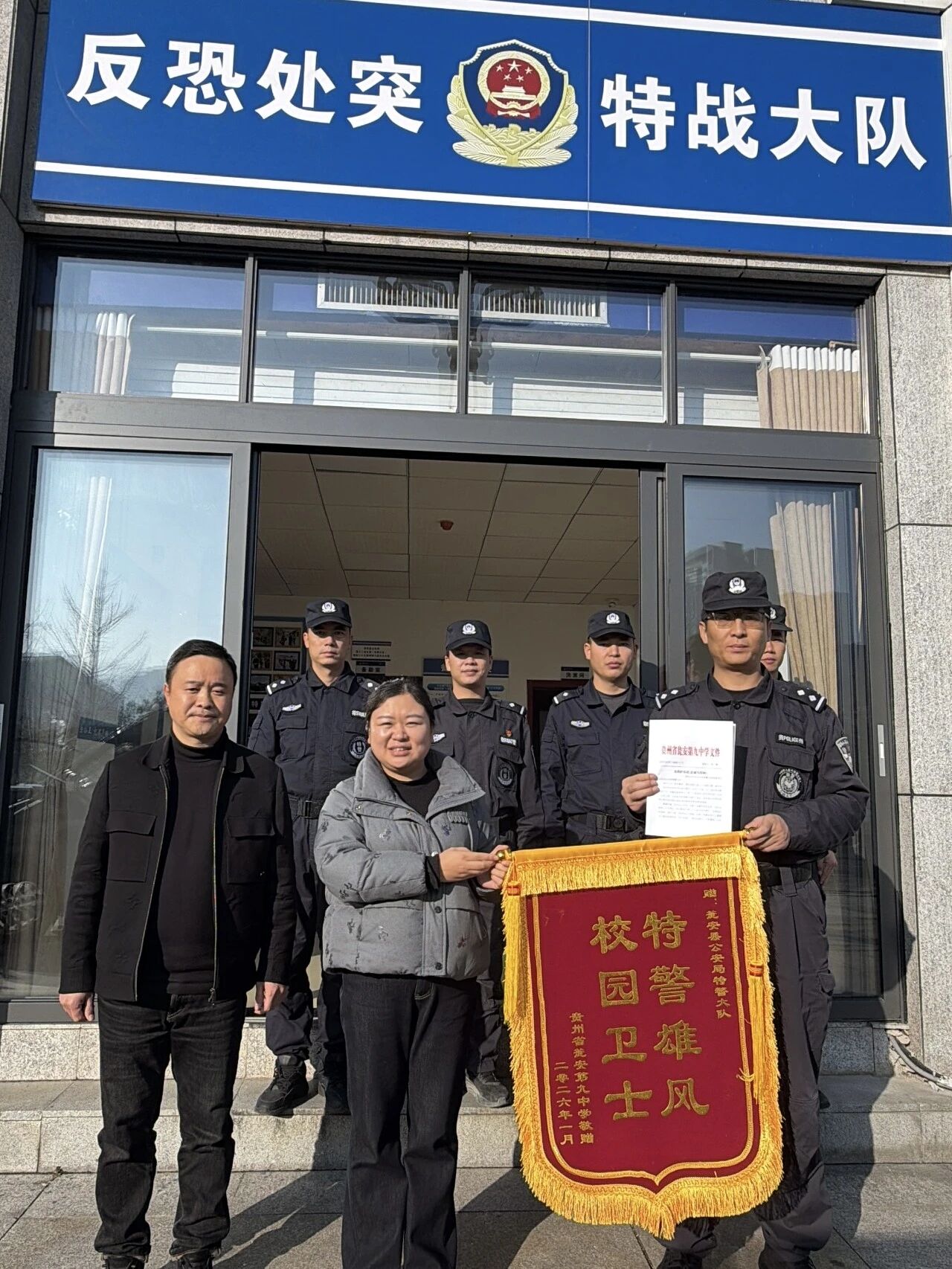 1月13日,瓮安县第九中学将一面印有“特警雄风、校园卫士”的锦旗和一封一号文件签发的感谢信送到瓮安县公安局特巡警大队,感谢大队特警长期以来风雨无阻坚守“护学岗”,维护校园周边道路交通秩序,全力保障学生上下学安全。