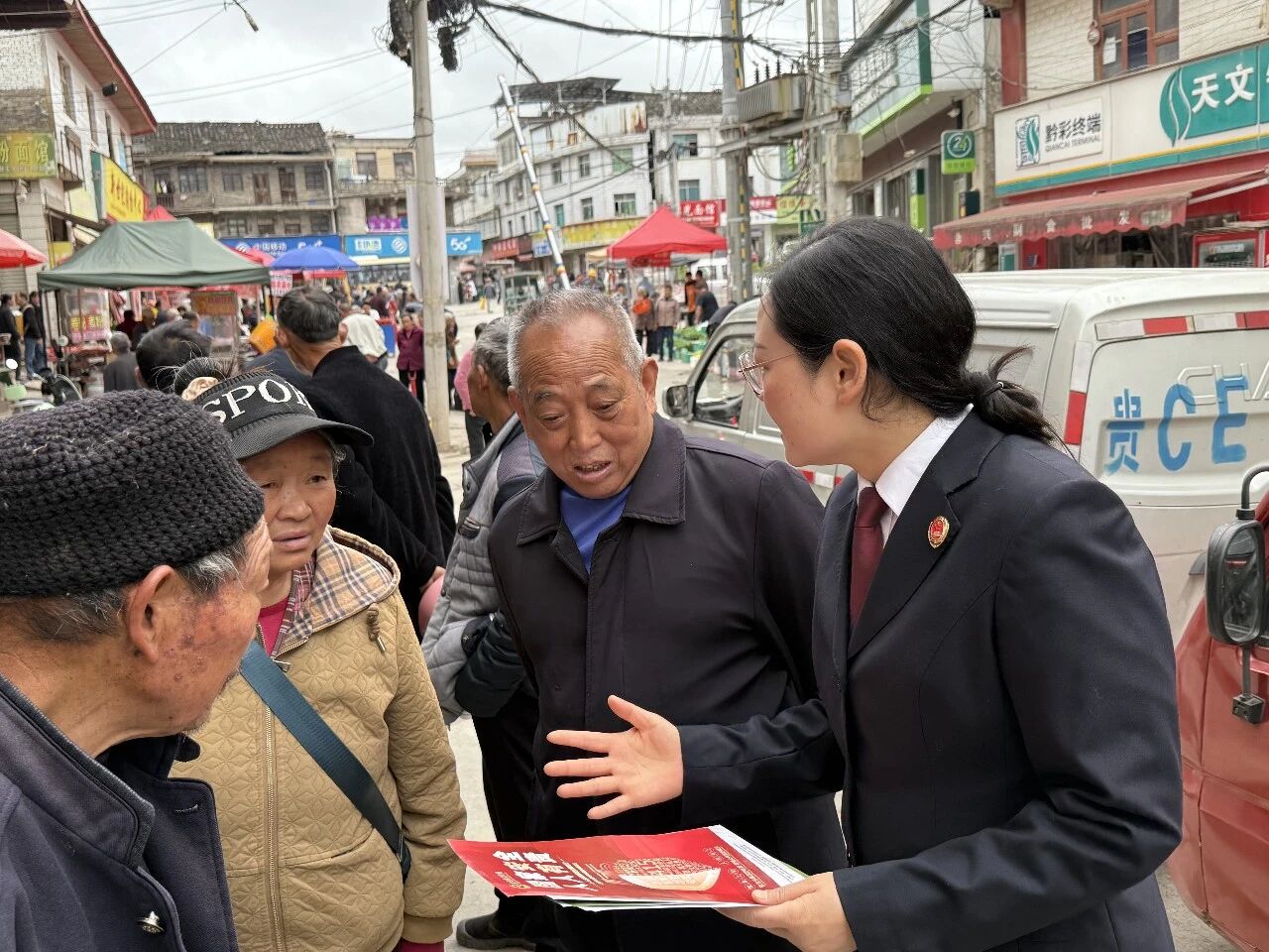 与此同时,瓮安县人民检察院联合辖区镇派出所、司法所,抓住乡镇赶集日人流集中的时机,在集市设立宣传咨询点,悬挂宣传横幅、发放宣传手册,用接地气的方言为群众讲解法律知识。工作人员围绕网络诈骗、邪教渗透、涉密信息泄露等乡村常见风险,以案释法、以法明理,耐心解答群众疑问,帮助大家破除“国家安全与己无关”的错误认识,引导群众主动参与、共同守护国家安全。